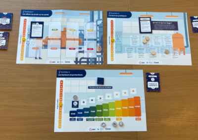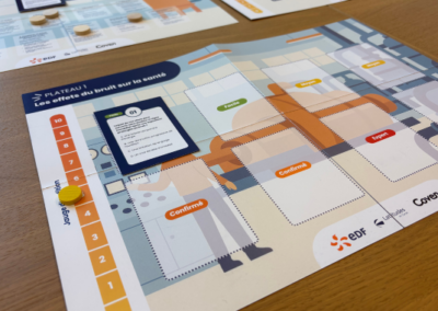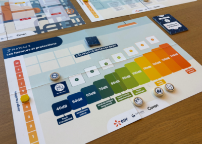 L’objectif était clair : créer une box de jeu jouable en 10 minutes, capable d’ancrer les bons réflexes et de faire comprendre les impacts du bruit sur la santé, les facteurs d’exposition et les solutions existantes.