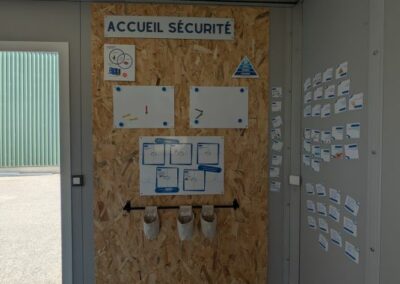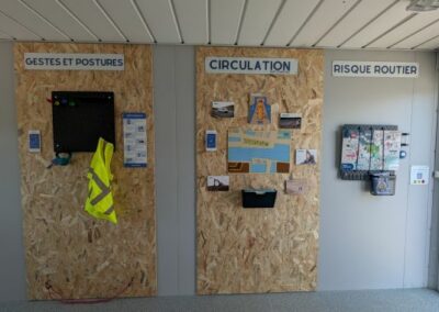 Une fresque aimantée représente un chantier en activité. Les participants doivent identifier les risques liés à la circulation, à la coactivité et aux interactions engins/piétons.