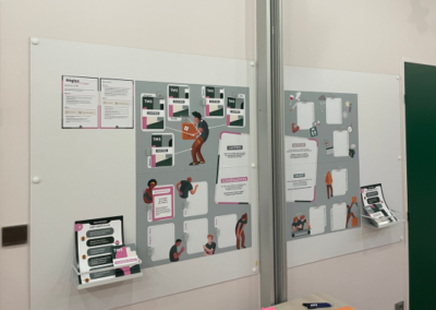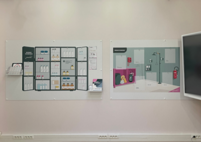 Pour l’atelier dédié au risque chimique, Coven a repensé l’un de ses serious games : la box prévention « risque chimique ». Coven a donc conçu un dispositif spécifiquement adapté aux contraintes logistiques du Dojo Sécurité de Sanofi, reposant sur deux grands plateaux aimantés, favorisant la manipulation et les échanges dans un espace restreint.